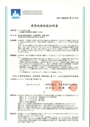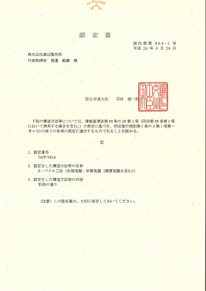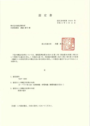 D・パイルⅡ工法にて引き抜き方向に対応し、国土交通大臣認定を取得しています。